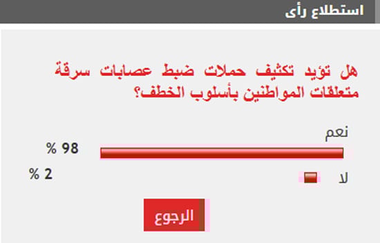 وأيد 98% من القراء مطالب تكثيف حملات ضبط عصابات سرقة متعلقات المواطنين بأسلوب الخطف، بينما عارض 2% من القراء مطالب تكثيف حملات ضبط عصابات سرقة متعلقات المواطنين بأسلوب الخطف.