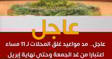 ويبدأ من غد الجمعة، وحتى نهاية شهر أبريل الجاري، تفعيل قرار مجلس الوزراء، بشأن مواعيد غلق المحال العامة، والمراكز التجارية، والمطاعم، وغيرها، أمام الجمهور، في الحادية عشرة مساءً، بدلا من التاسعة مساءً، وفقا للتوصية الصادرة من اللجنة المركزية لإدارة الأزمات؛ وذلك بمناسبة أعياد المواطنين المسيحيين.